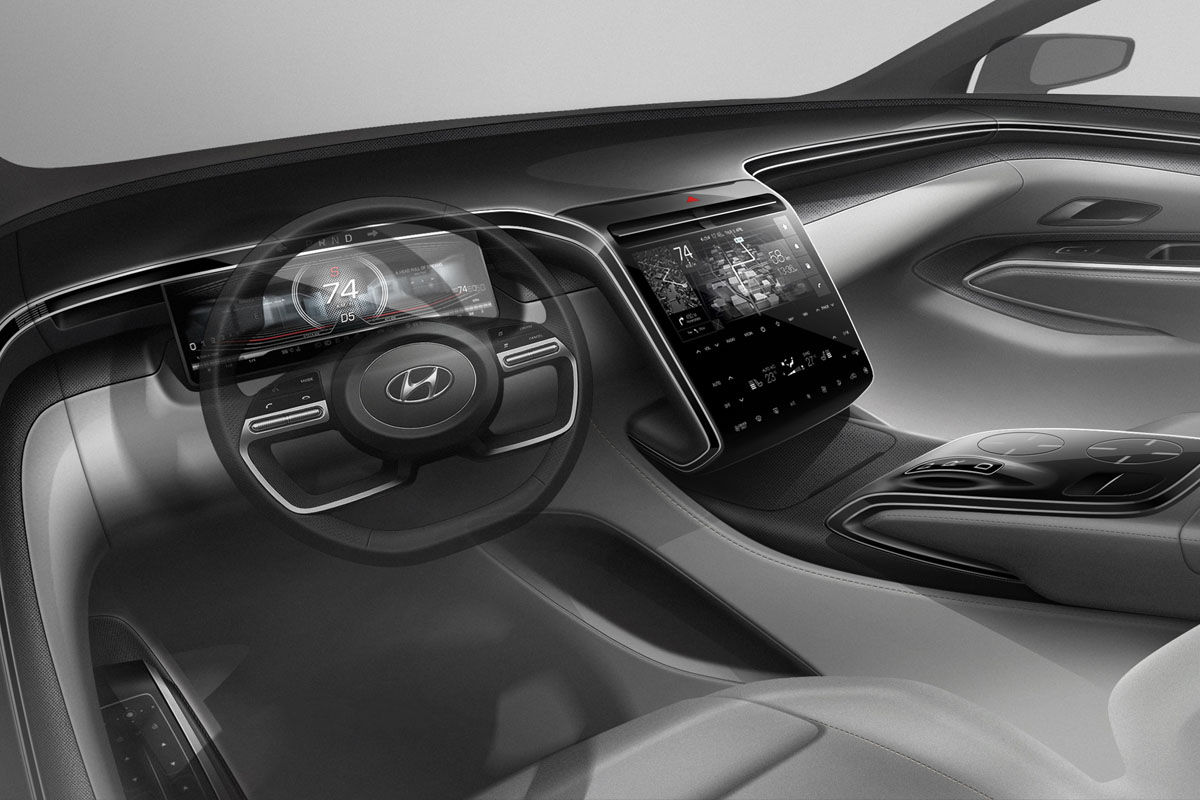 As for the interior, Hyundai says its “dual-cockpit layout offers personalised space intuitively optimised for a high-tech user experience… an interspace with an integrated interface”.