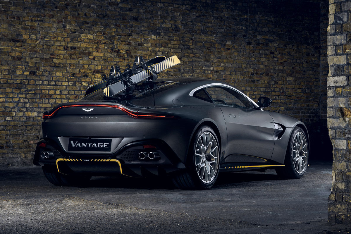 The Vantage 007 Edition features a bespoke mesh grille (with chrome surround) as an homage to the classic V8, plus side-strake Vantage badges and a yellow-accented diffuser inspired by the stripes on the film car’s rockets. The skis and ski rack – which reference the “winterised” V8 in the film – are optional.
