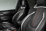 Beyond the exterior design details, Toyota has updated the Corolla GR Sport’s interior too. Drivers grab hold of a steering wheel rim which is trimmed in perforated leather, whilst the front seats have been reshaped to provide lateral support. They are also upholstered in a blend of black fabric and white leatherette, bonded with red stitching.