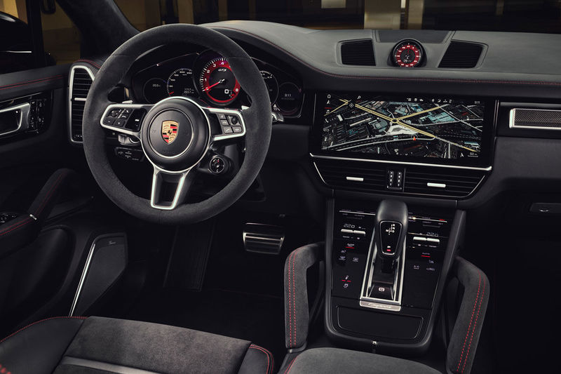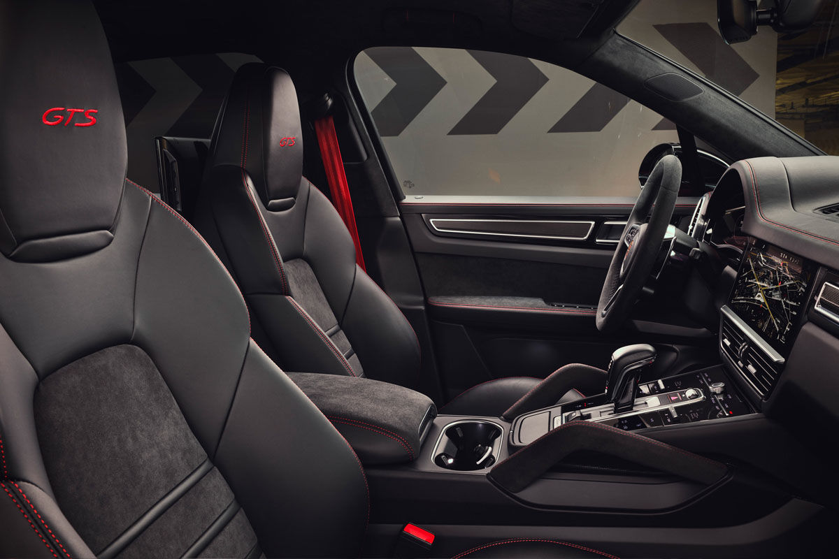 The 8-way electrically adjustable sports front seats (trimmed in a combination of leather and Alcantara, with GTS logos embroidered on the headrests) are exclusively reserved for the pair of newcomers to the Cayenne family, while the derivatives' (also GTS-marked) door-sill finishers are made of dark-brushed aluminium with a black anodised finish.