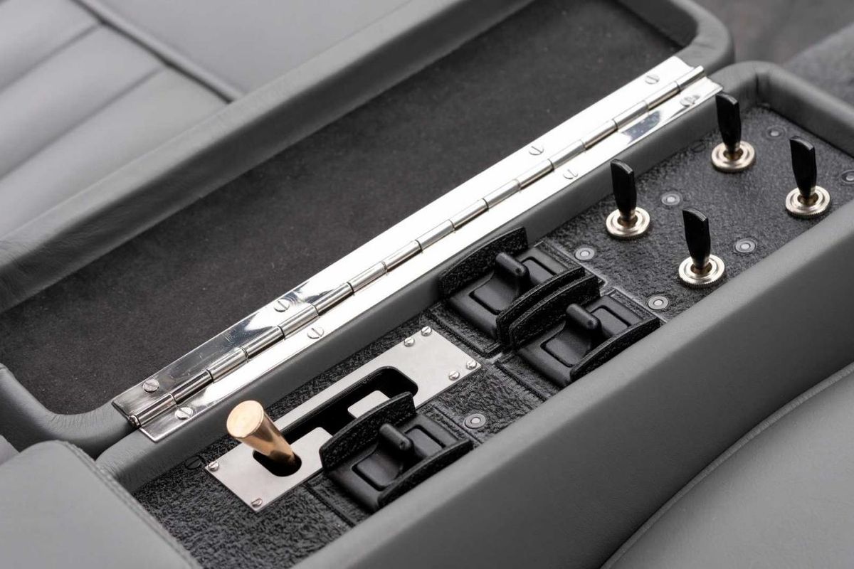 The DB5 is finished in Birch Silver and as a tribute to the car that featured in Goldfinger, comes fitted with nifty features such as 2 faux machine guns, a smokescreen, a revolving license plate and battering rams, just in case…There's even a faux tyre slasher, oil spilling device and a bullet shield to protect you from gunfire. This DB5 is the real deal… A removable roof panel for the passenger seat is optional.