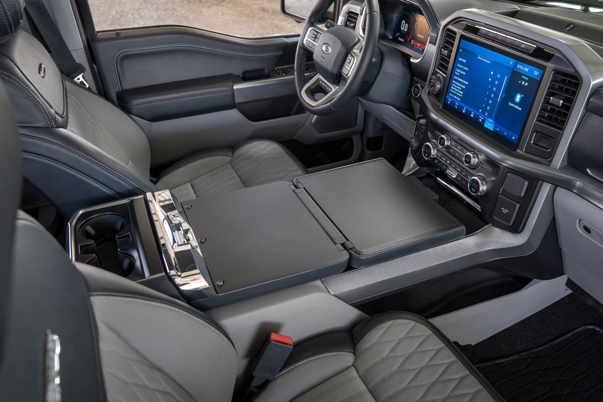 The new optional Interior Work Surface, which folds out over the centre console/between the front seats is ideal for signing documents, working on a laptop or enjoying a meal when parked. To aid its installation, Ford has created a stowable transmission lever, which away at the push of a button, and allows full access to the large work surface.