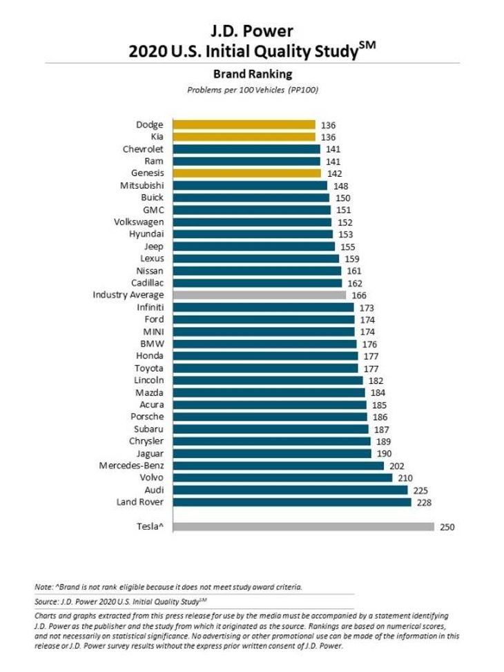 2020's iteration also marked the debut of Tesla into the J.D. Power IQS, but with 250 PP100, it's a very poor result for the electric carmaker and it places them at the bottom.