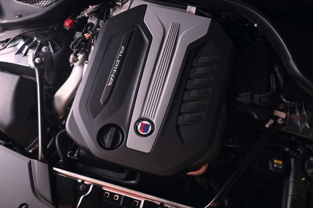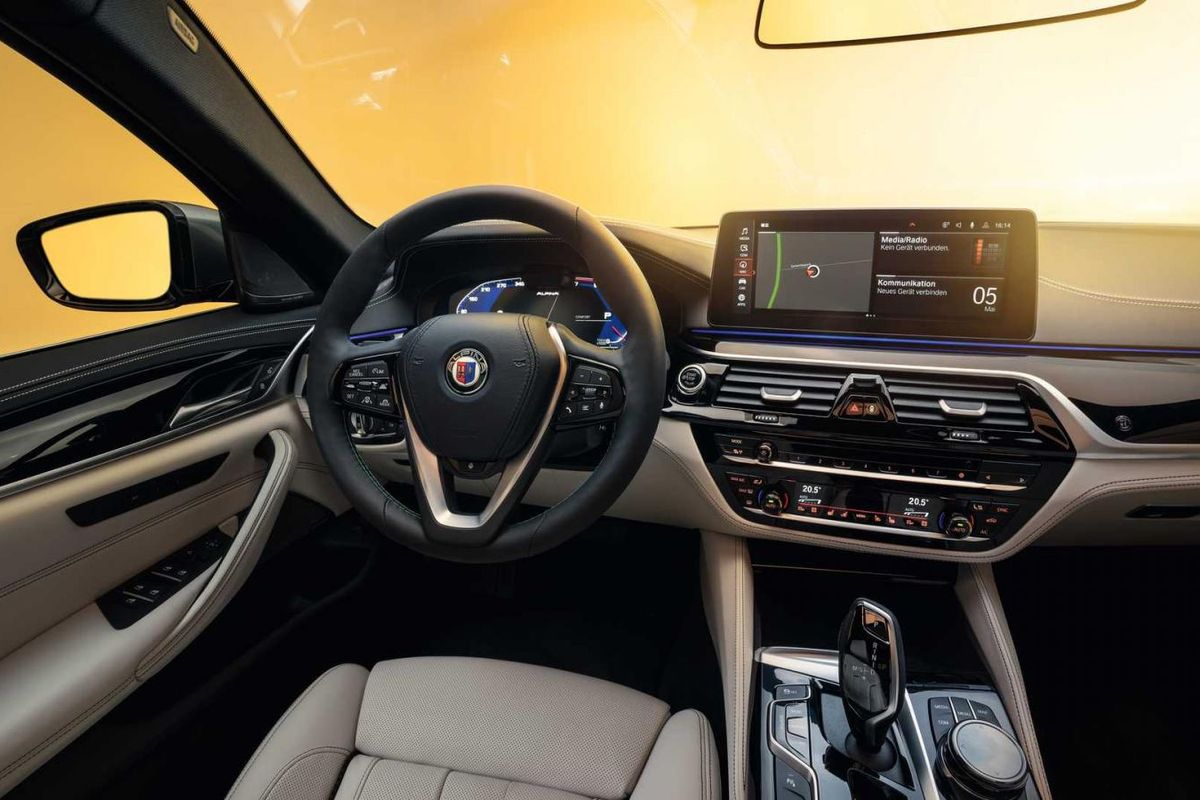 Power peaks at 457 kW, supported by 800 Nm of torque. Those numbers compare very favourably with the M5 Competition figures of 460 kW and 750 Nm. To ensure the required acoustic drama, there are Alpina dual-outlet sports exhausts, which exit at each corner of the remoulded rear bumper.