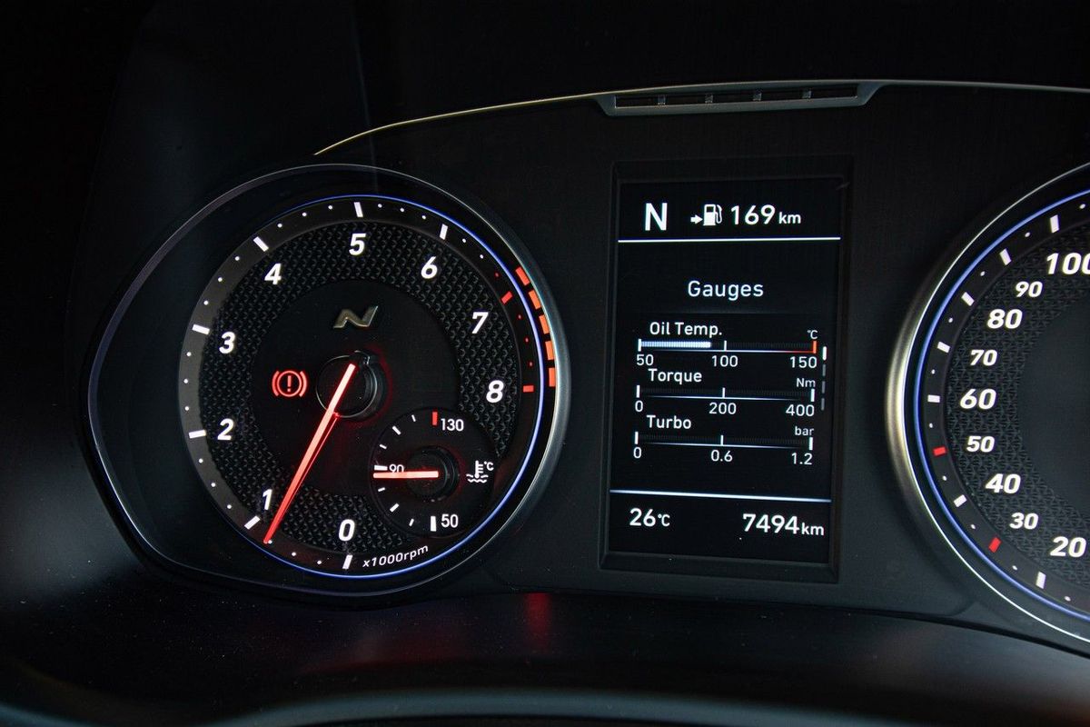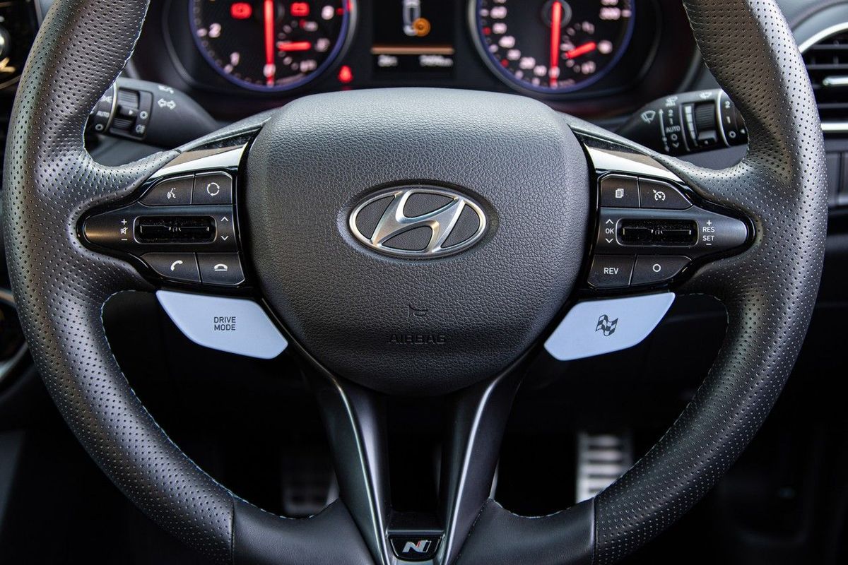 Modes? Yes, this car is all about modes and how they change the characteristics of the engine, suspension, differential, traction control and exhaust note. You can work your way through the drive modes via the steering-mounted button with your left thumb, which will scroll through Eco, Normal and Sport modes. The chequered flag button on the right puts everything into N mode, which is the most aggressive setup on all the aforementioned parameters. N mode can further be customised by using the infotainment screen menu.