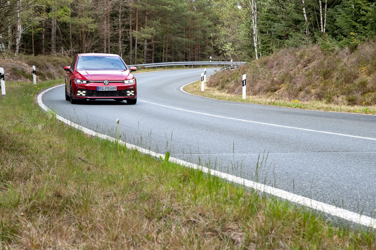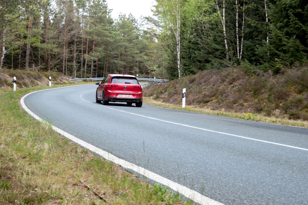 Today isn’t about drivelines, though. It’s about exploring dynamic qualities. And Volkswagen’s Ehra-Lessien facility is just the place to show us what the new Golf GTI can do. It has everything: endless straights, where you can run flat out for minutes on end; banked corners, where the centrifugal forces allow the driver to go hands-off above certain speeds; handling roads, featuring every kind of corner, camber and surface you could ever wish for and much more. It is torture for any car, but it also provides valuable insight into on-the-limit behaviour without having to venture out onto public roads.