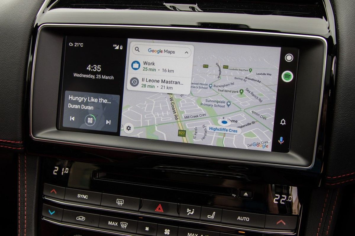 Android Auto connected and the digital dashboard in its coolest layout setting. Red stitching adds to the sportiness.