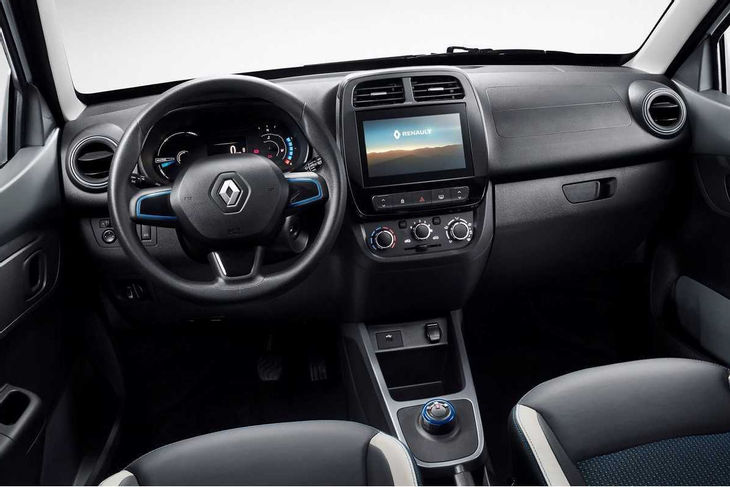 The K-ZE's interior will be instantly familiar to Kwid owners; note the blue-accented drive-select knob on the centre console.
