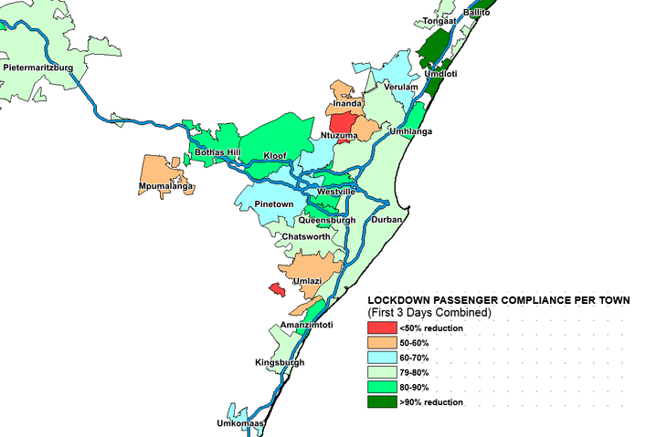 There are certain outliers when broken down into area-specific movement that have not complied as much as everywhere else. In Gauteng, there is still a lot of movement around Soweto, Tembisa and Delmas. Similarly in the Western Cape, Khayelitsha, Blue Downs and Guguletu have seen movement only reduced by 50%.
