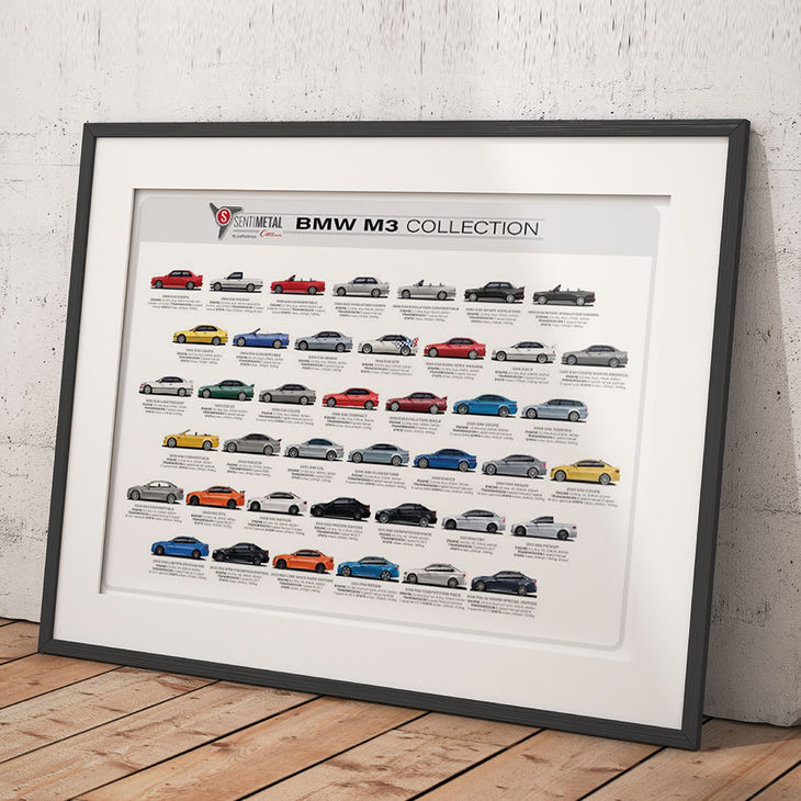 The store's top-seller is this magnificent A1-size print featuring 30 years of BMW M3s.