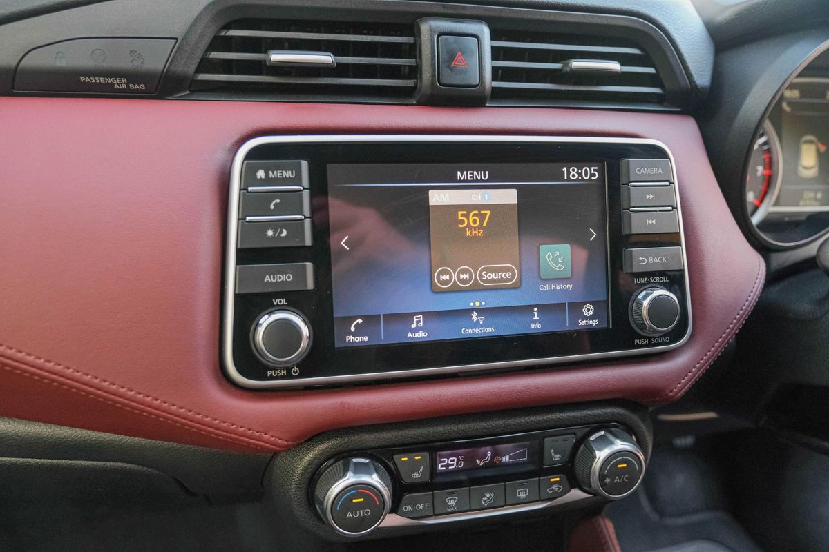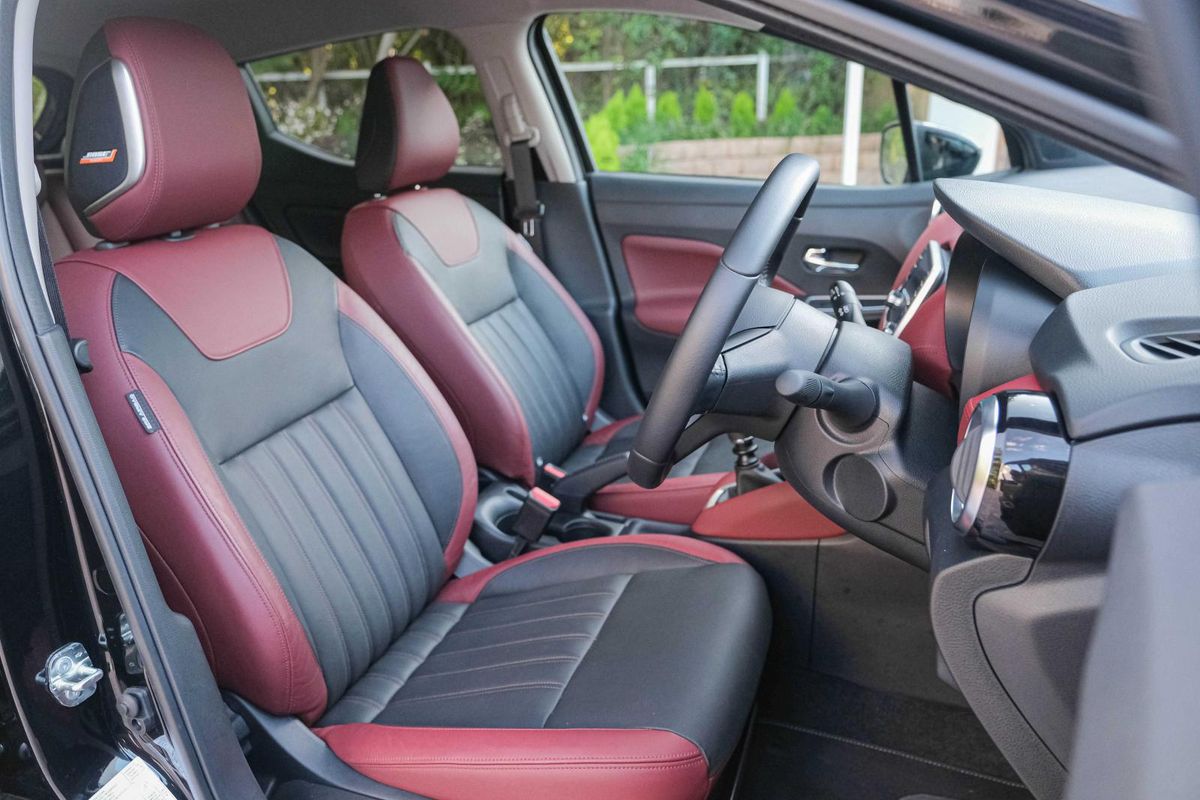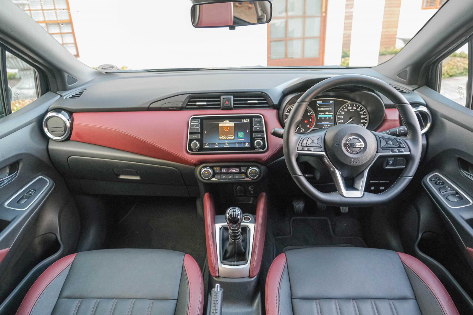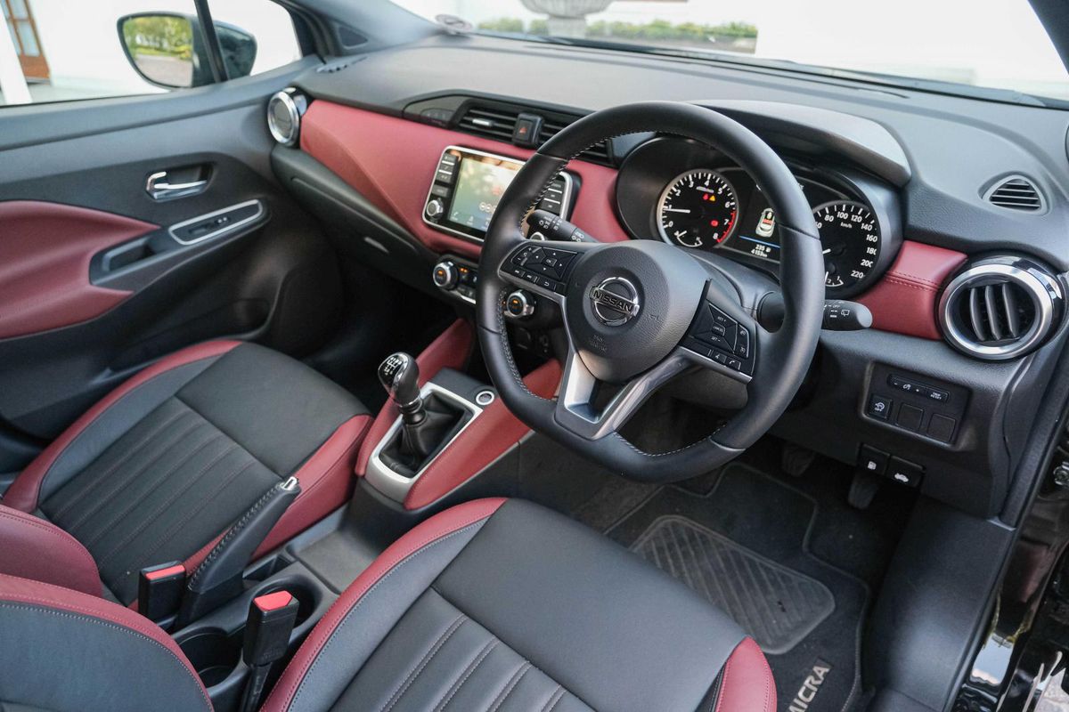 A smartly executed red-and-black leather interior adds premium appeal to this range-topping Micra.