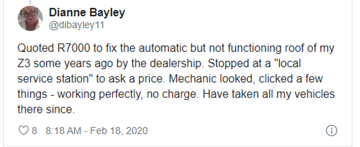 Social media reaction to the news of the draft guidelines was mixed. Freelance writer Dianne Bayley was firmly in the pro camp: “I was quoted R7 000 to fix the automatic, but not-functioning roof of my BMW Z3 some years ago by the dealership,” she tweeted.