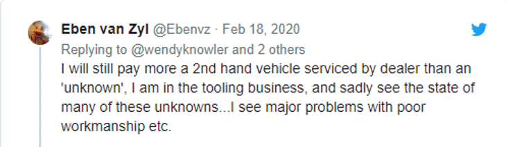And Eben van Zyl added: “I will still pay more for a second-hand vehicle serviced by a dealer than an “unknown”.