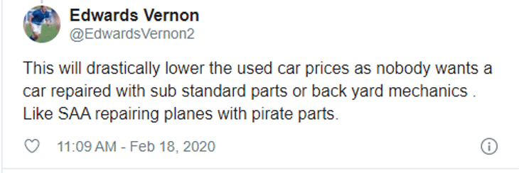 But Edwards Vernon took an opposite view: “This will drastically lower the used car prices as nobody wants a car repaired with sub-standard parts of back yard mechanics.”