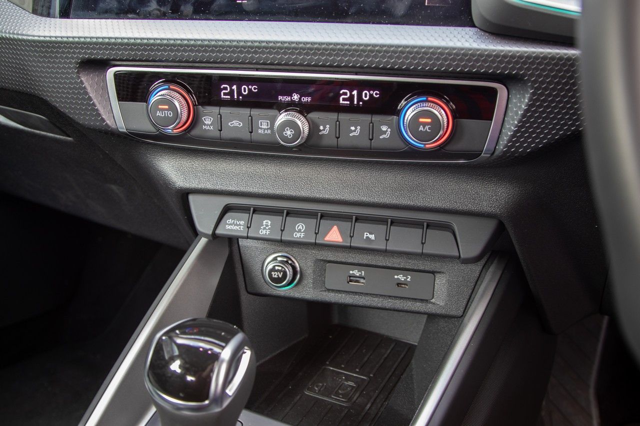 Dual-zone climate control and Audi Drive Select are standard on this model. Note charging pad and 2 USB ports.