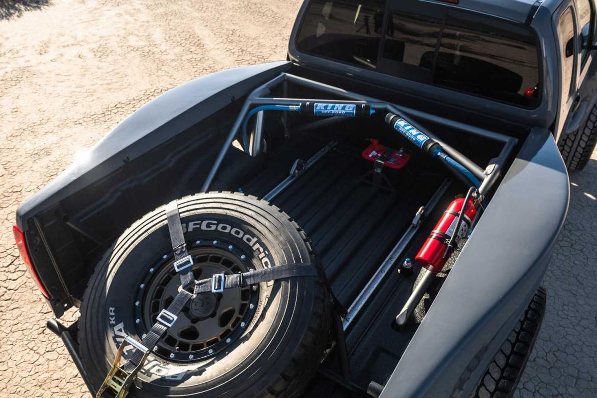 The only factory panels on this king cab Navara are its roof and doors. The bonnet, fenders and loadbin sides have all been reshaped to either provide superior cooling airflow or accommodate huge tyres. Nissan also deleted the tailgate, to create quick access to the spare wheel.