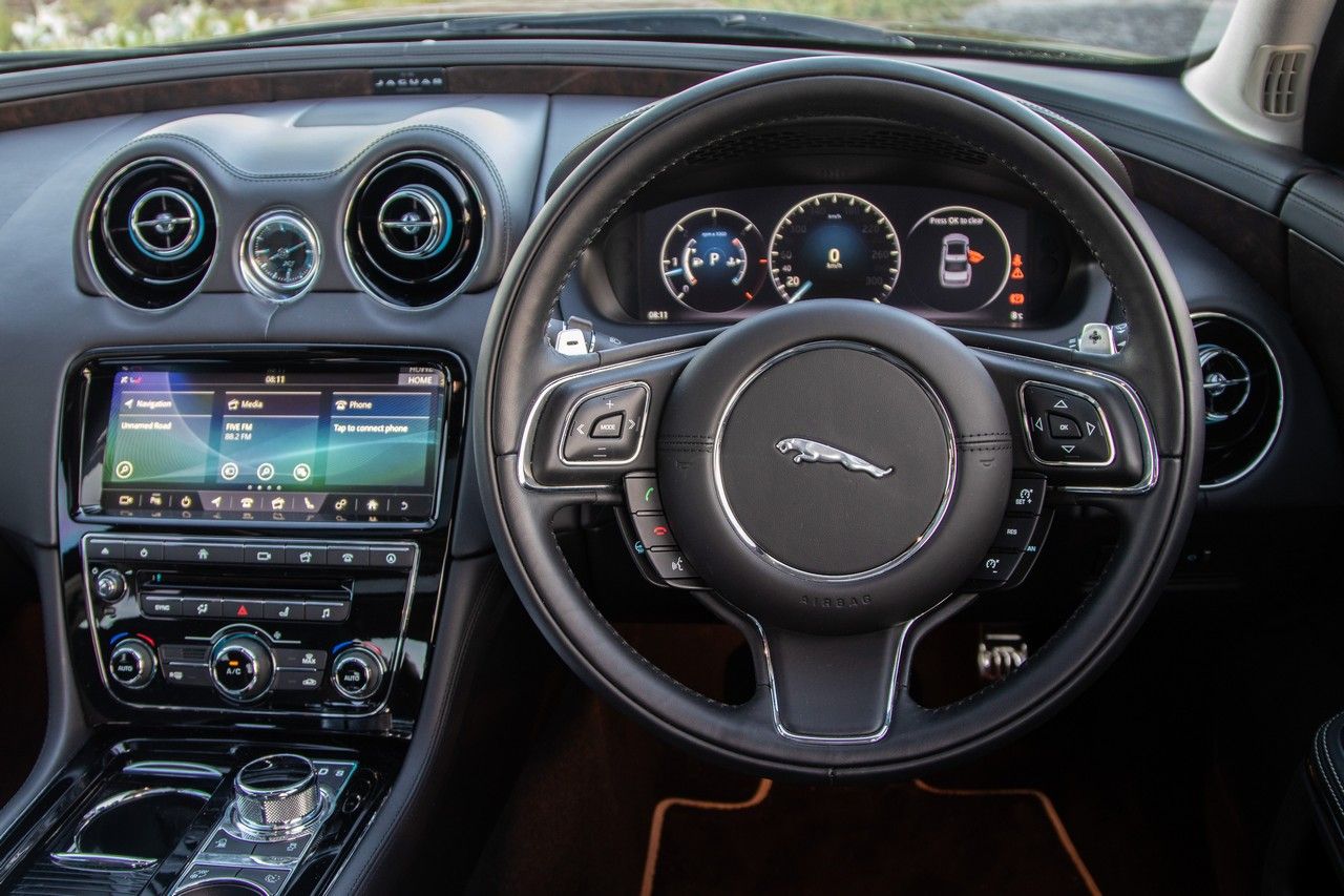 Leather, wood and chrome dominate the luxurious cabin, but in terms of design and quality of materials the XJ now lags the best