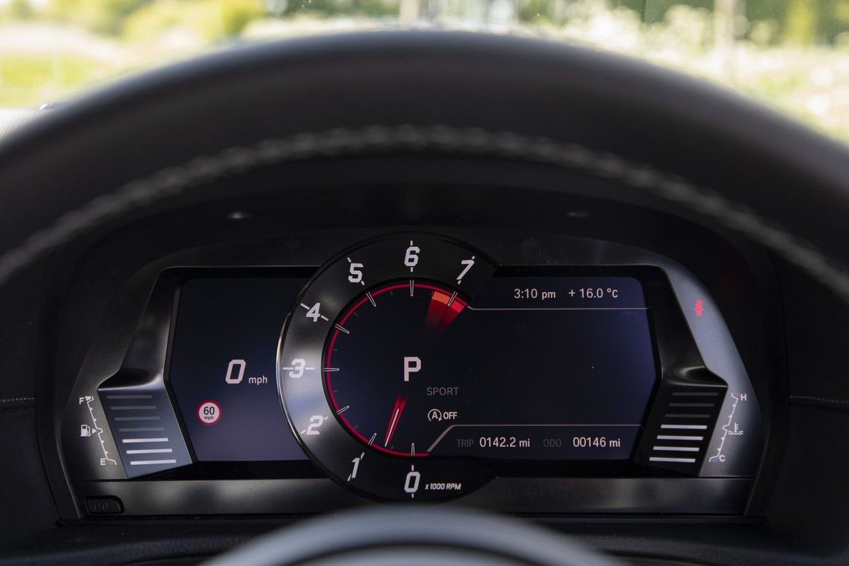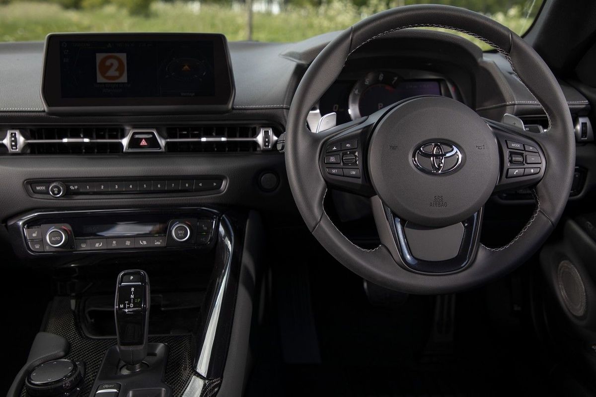 The driving position is well-balanced: it's suitably engaging (as it should be in a sportscar) yet a driver could easily spend longer journeys behind the 'wheel without suffering too much discomfort. The cabin is neatly laid out and we like the retro-inspired instrument cluster, which looks like it's from an early '90s video game. However, if you're familiar with the interiors of contemporary BMWs, you're bound to recognise many of the GR Supra's buttons and minor controls. The infotainment system, for example, looks like a reskinned version of a previous-gen BMW unit, while much of the Toyota coupe's switchgear (such as the transmission lever and the exterior lighting controls) come straight from the German firm's parts bin.