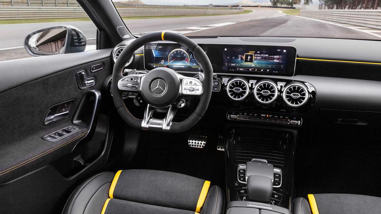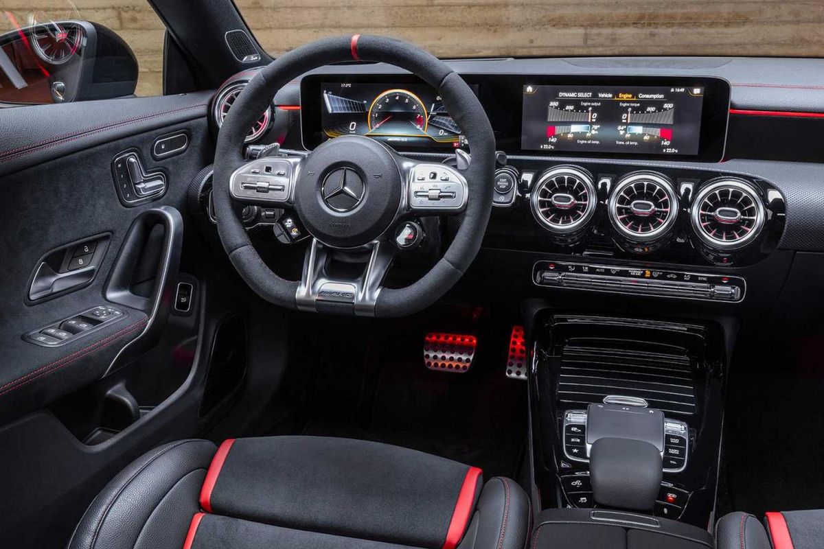 The 2020 Mercedes-AMG A45 S cabin features the MBUX infotainment system.
