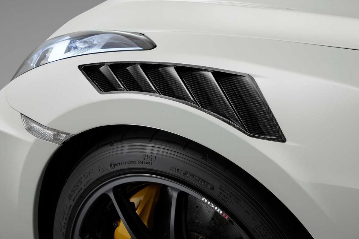As one would expect from such a track-focused customer car, Nissan’s aerodynamicists have adopted scalloped air-vents, cut into the front fenders, which help extract and channel hot heat away from the engine bay.