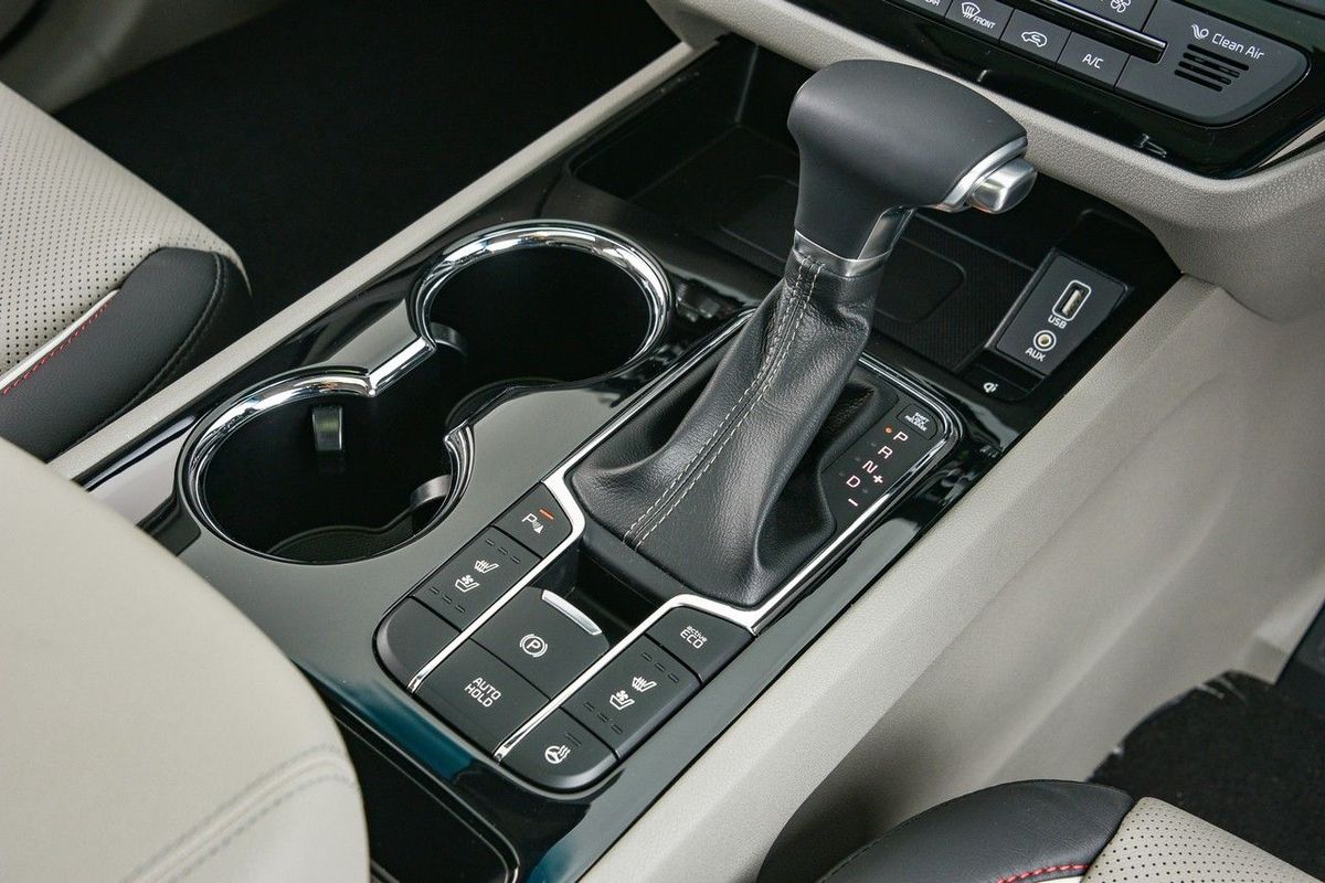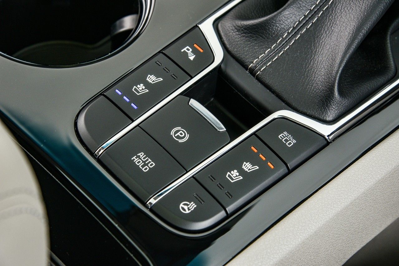 Auto Hold and electronic park brake are new additions to the Grand Sedona. Also note heated/cooled front seats and heated steering wheel button.