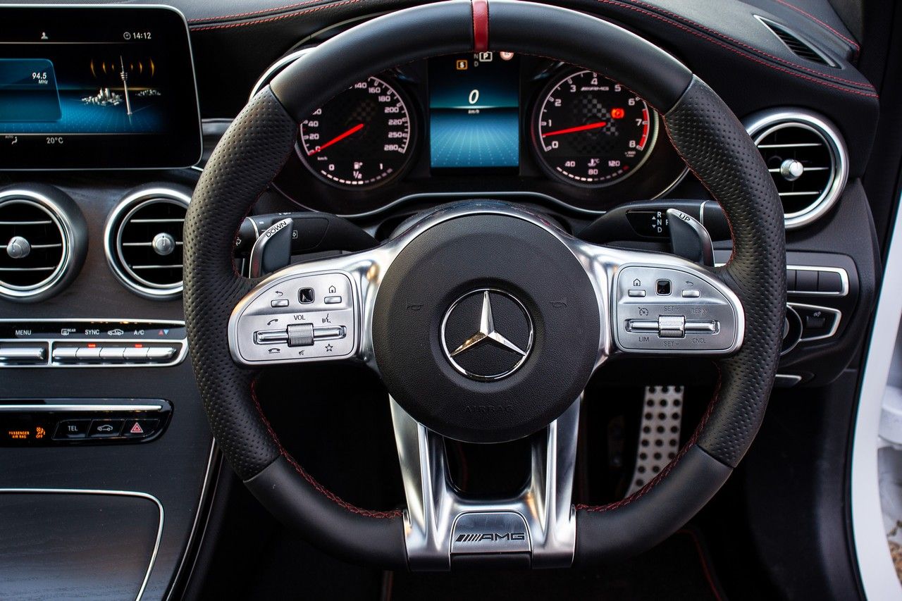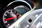 Meanwhile, the steering wheel in the Mercedes-AMG C43 is a masterpiece and our favourite part of the cabin. It's of a flat-bottomed design and has elements lifted directly from an S-Class. We're glad to see the cheap-feeling cruise control column stalk of the previous car has been removed; the system is now operated by toggles on the 'wheel. The shift paddles have a lovely mechanical feel to them and are mounted to the back of the tiller, as opposed to the column, which is great, because you're likely to find yourself using them often to get the best out of the car's performance.