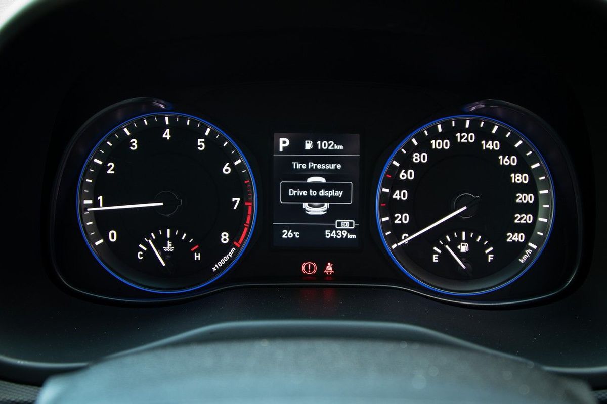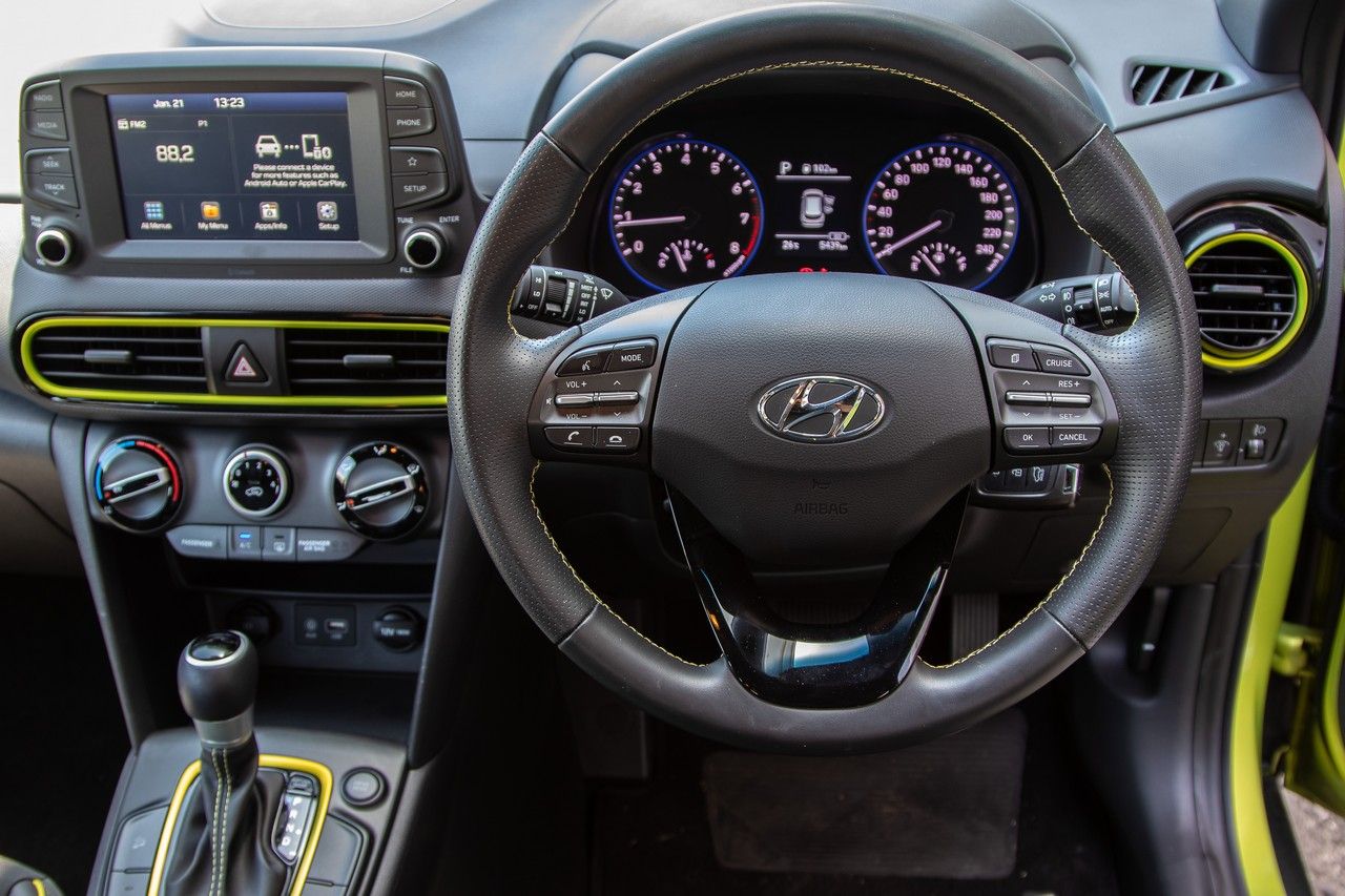 We love the green detailing in the Kona. The driving position is comfort orientated and the dials are crisp and clear.