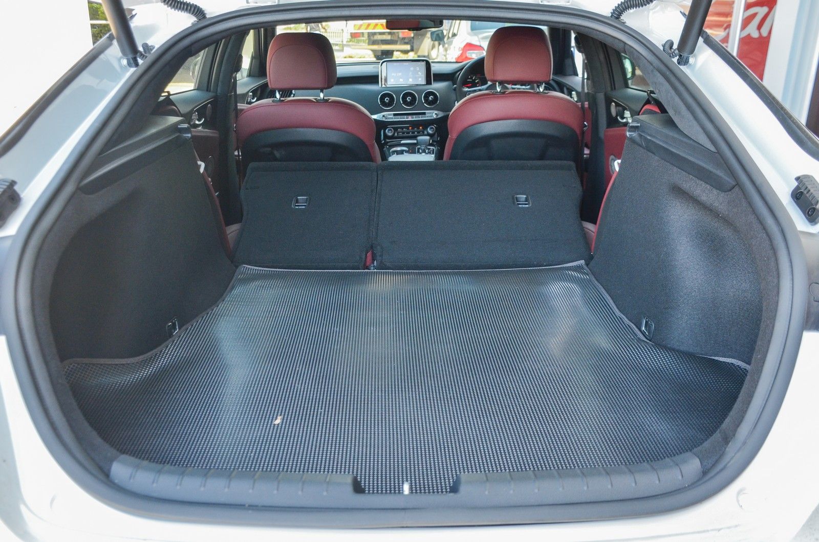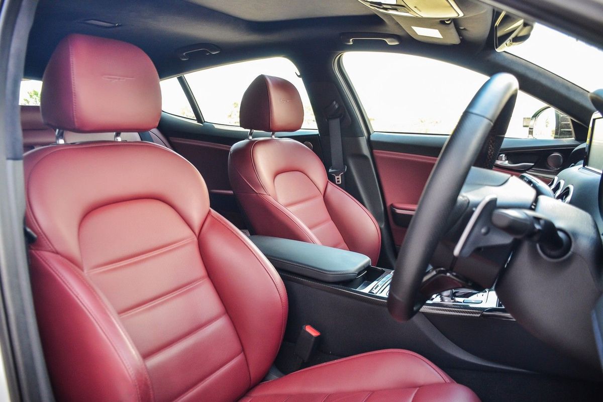 The Stinger has its opposition well and truly licked in terms of rear legroom. The scarlet leather trim is an acquired taste, however.
