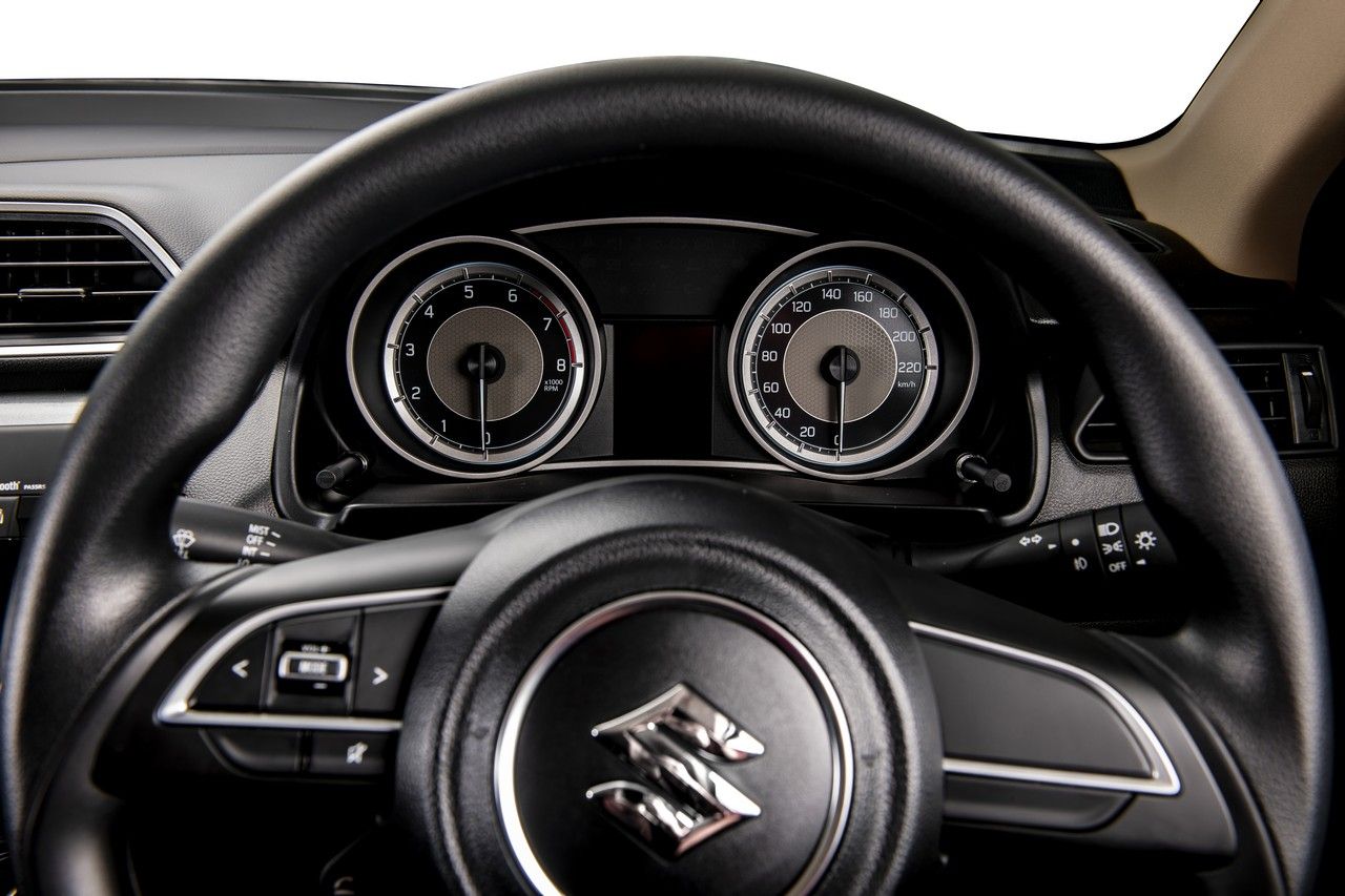 The Dzire's instrument cluster has an understated (almost retro) elegance to it. Note the combination of black and grey elements.