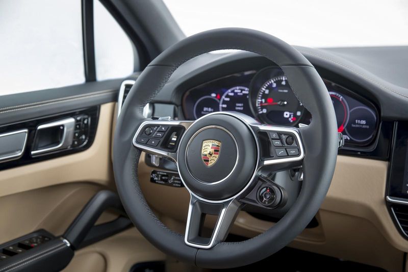 With the selection of the Sports Chrono package, the Cayenne's steering wheel gains a drive mode selector button (bottom right).