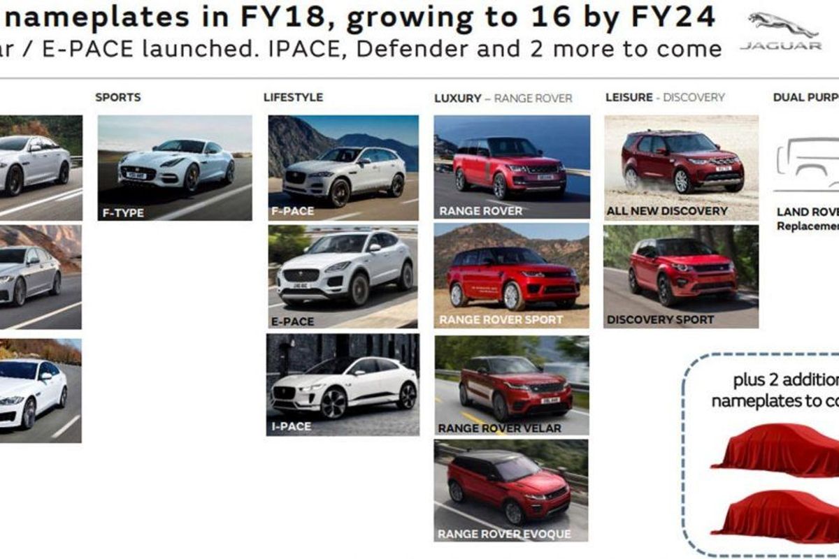 Underpinning these new models as well as the replacements will be all-new platforms. Jaguar Land Rover calls them the Modular Longitudinal Architecture (MLA) and the Premium Transverse Architecture (PTA), and we'll see the latter make its debut in the facelifted Range Rover Evoque. We'll expect it to underpin the all-new E-Pace too. The MLA platform is predicted to form the basis of the all-new Defender in 2020.