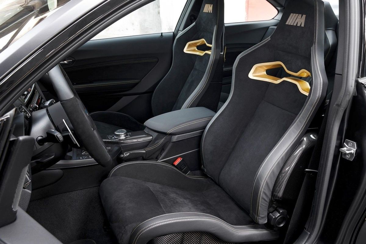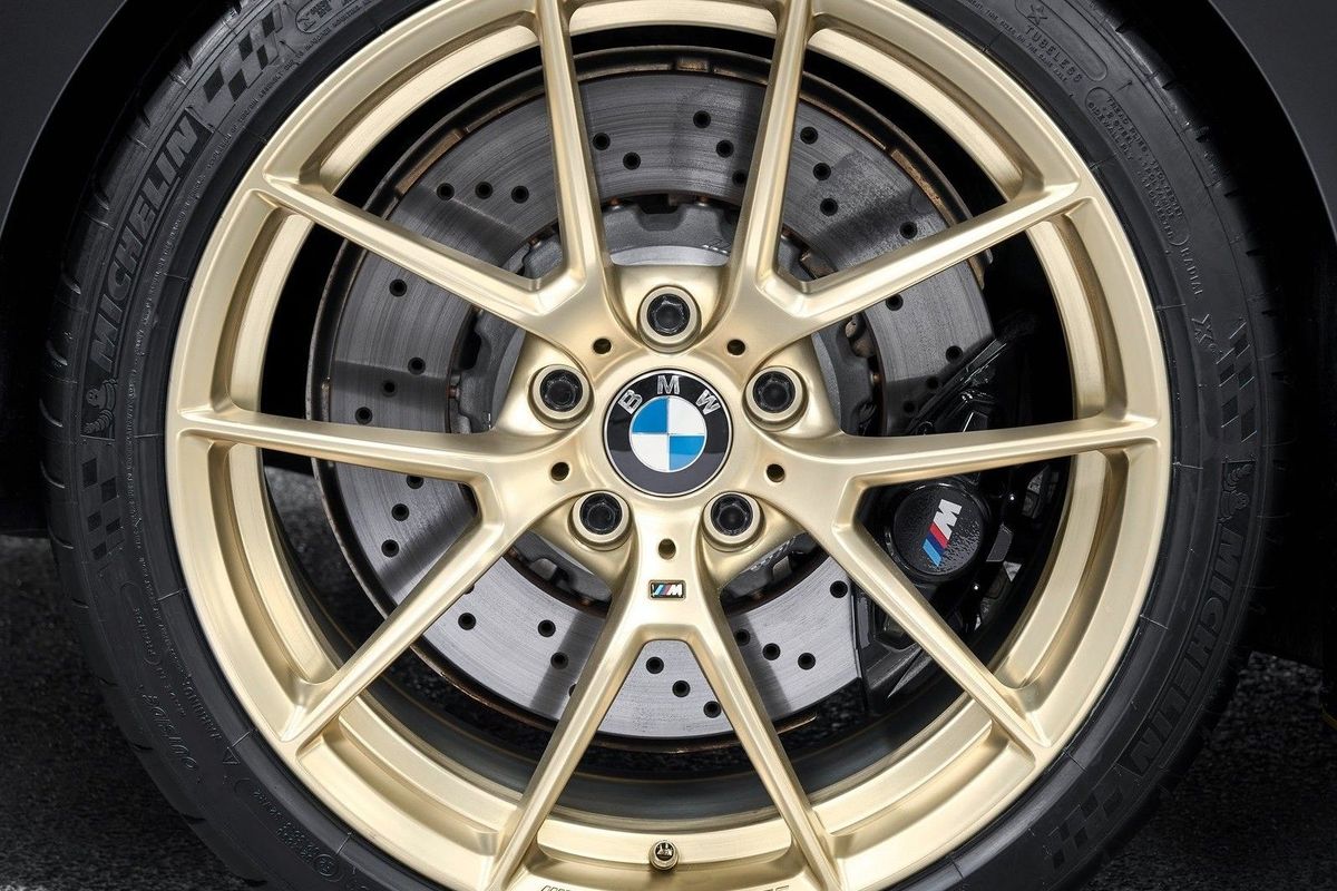There's plenty of carbon fibre parts which serves two purposes. Firstly it looks awesome and secondly, it reduces overall weight. The front radiator grille saves 8kg, the front side panels each save 3 kg while helping with aerodynamics, the roof shaves a further 6 kg and the rear spoiler reduces weight by 5 kg. How nice are these wheels too? These are lighter-than-standard 19-inch M Performance forged alloys in a Frozen Gold colour, wrapped in Michelin semi-slick rubber. A further 6 kg is saved with these wheels. The obsession with weight reduction is even evident in the battery, which has been replaced by a unit which is 14 kg lighter.