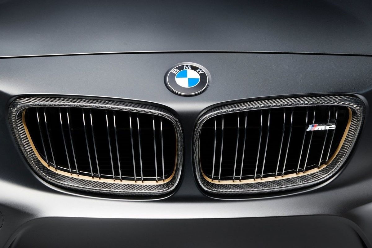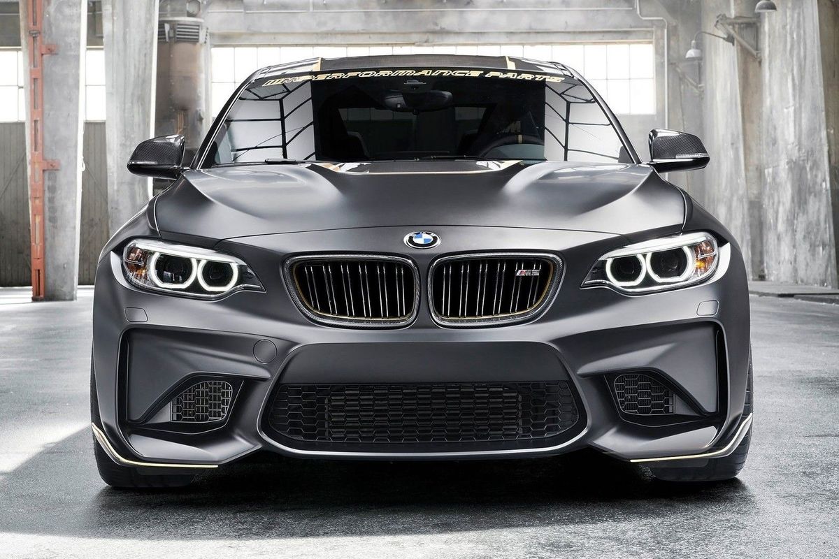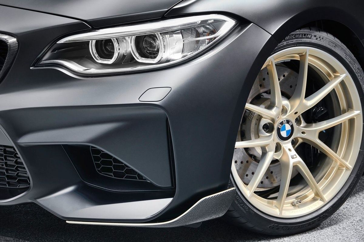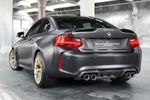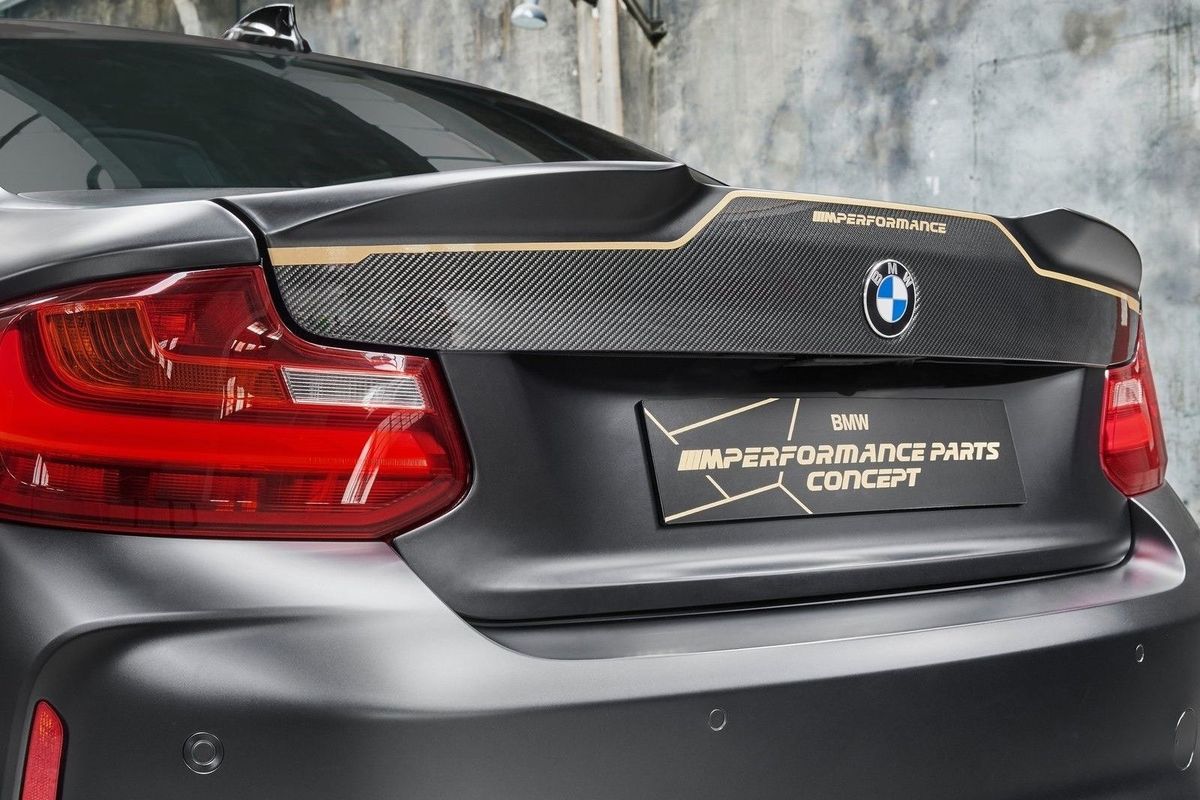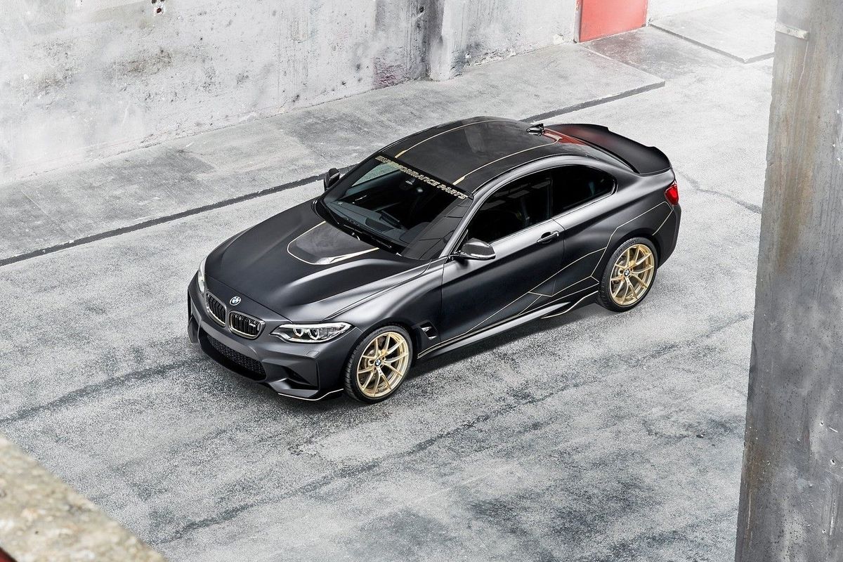 However, BMW is keen to show off what can be done with the significant use of carbon fibre, weight saving and optimised aerodynamics. This is the BMW M Performance Parts concept, which takes the idea of the M2 and enhances it. Finished in a matte Frozen Black finish with extensive use of gold detailing, this BMW M2 looks mean and imposing.
