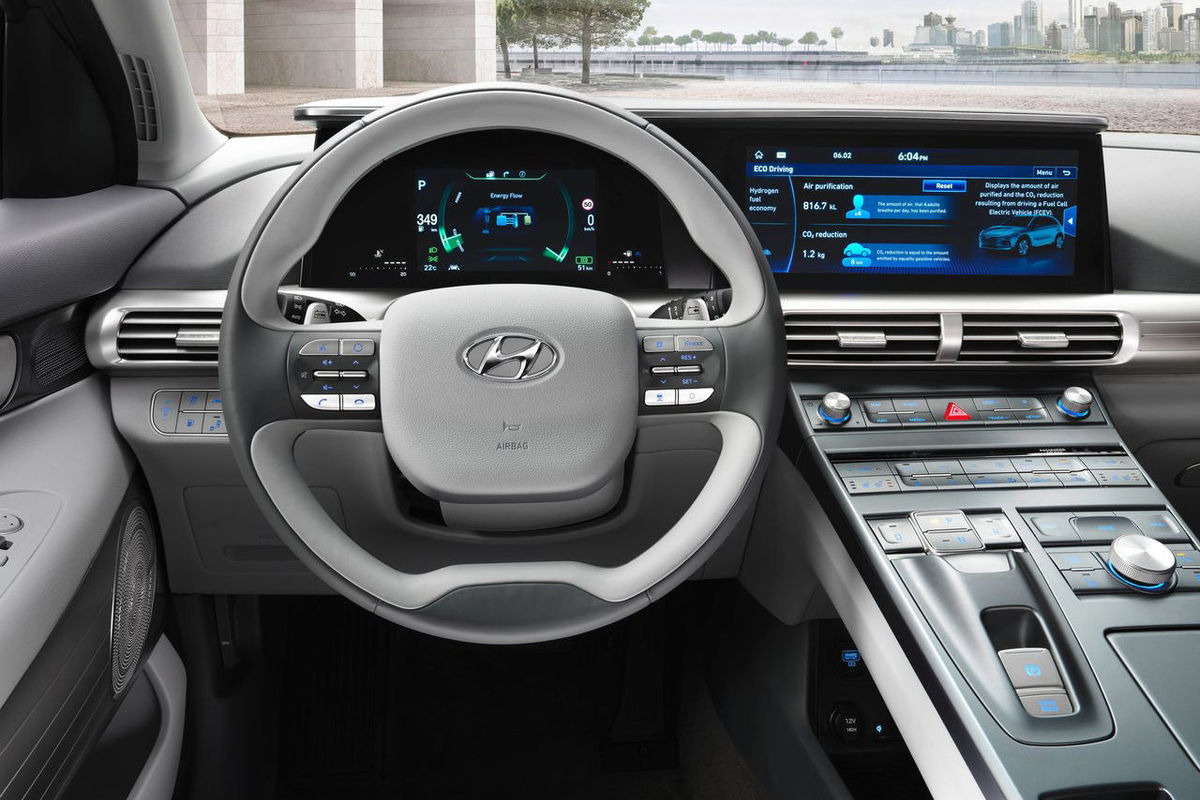 As a fuel cell vehicle, the Nexo does not emit particulates into the air, in fact, it is said to purify the air. When air filters through the Nexo, 99.9% of particulates are purified and the instrument cluster displays how much you have contributed towards cleaning the environment around you. It actually reduces fine dust pollution of two turbodiesel cars travelling the same distance.