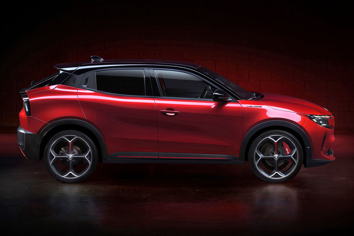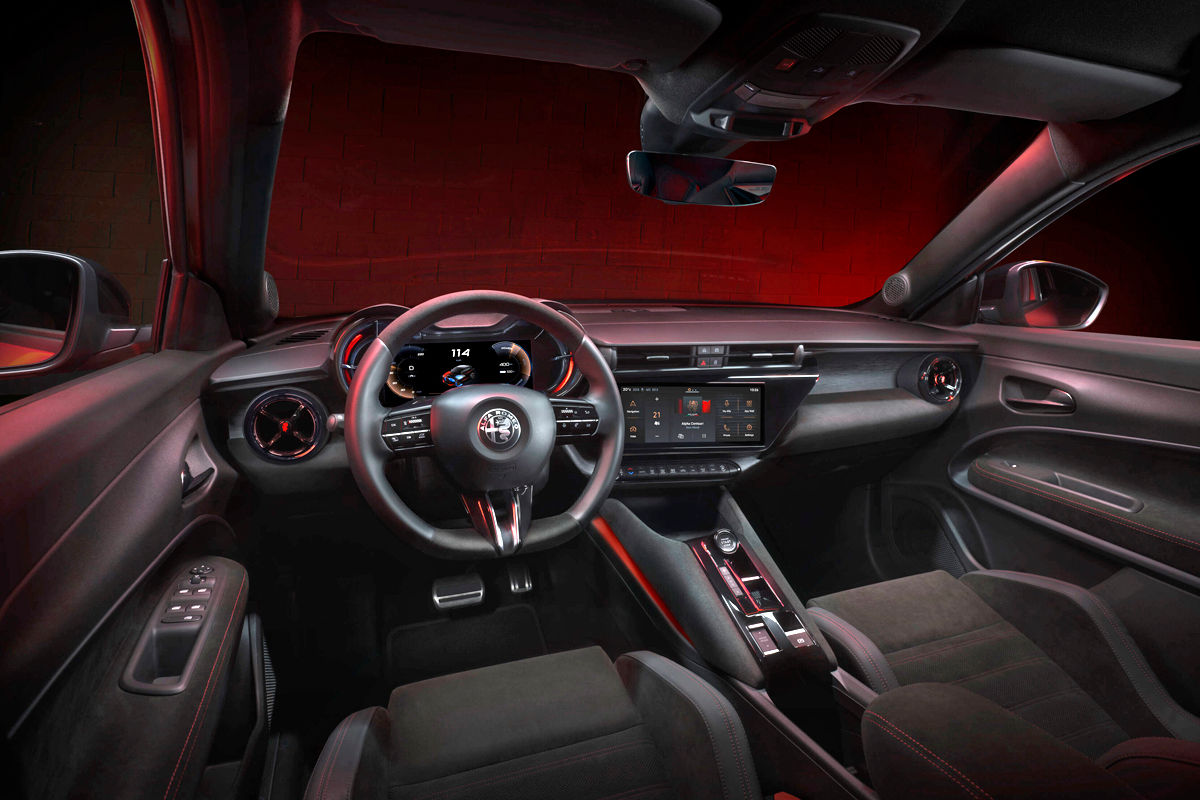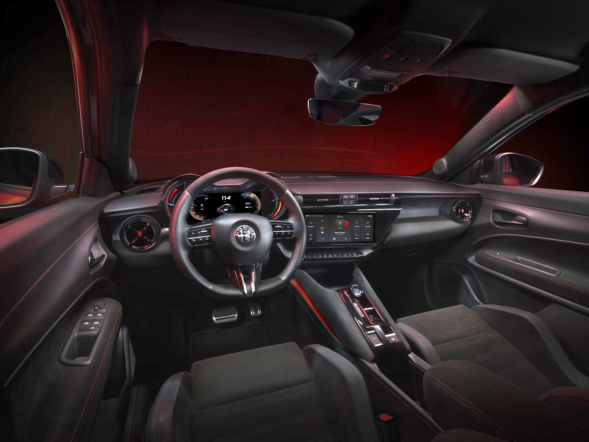 The Veloce upgrades to 20-inch alloys and scores a 25 mm lower suspension plus a limited-slip differential and an 11 kW onboard charger. It furthermore features fabric-and-vinyl upholstery, electrically adjustable front seats (including a massage function for the driver), ambient cabin lighting, keyless go, adaptive cruise control, a 6-speaker sound system and a model-specific design for the “V-shield” grille.
