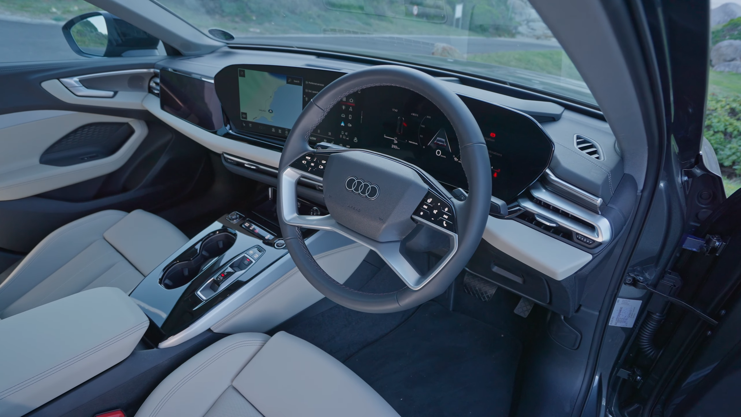 A: The cabin features a significant departure from older Audi cabins, centered on a large, curved central screen with an Android-based software system and a highly customisable digital instrument cluster.
