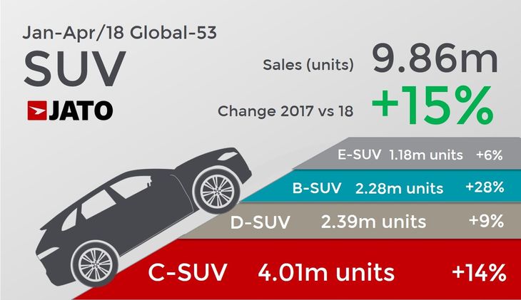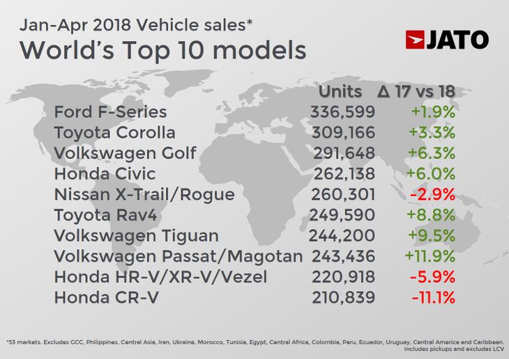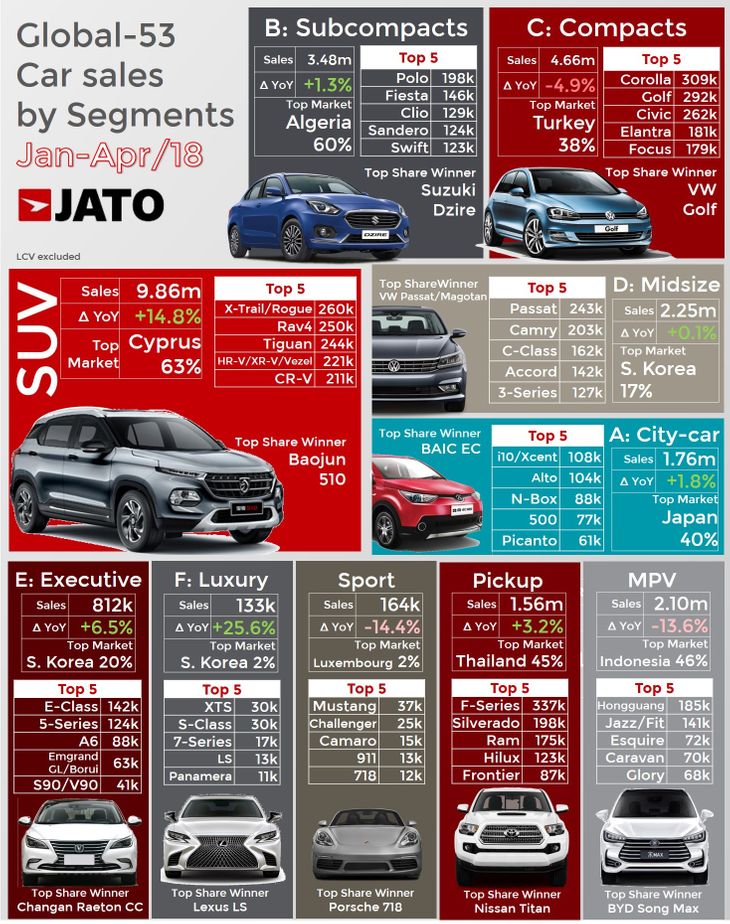 The rise of the SUV continues unabated as the segment notched up 34% of the global market share. That makes it the segment with the most combined sales. The Nissan X-Trail tops SUV sales but it’s followed closely by the Toyota Rav4 and Volkswagen Tiguan. The segment seems to be seeing intense growth in the compact SUV segment where vehicles like the Renault Captur, Volkswagen T-Roc, Nissan Kicks and Honda HR-V are big sellers. The rise in SUV sales has seen MPVs take the biggest hit losing 13.6% market share in the first 4 months of 2018.