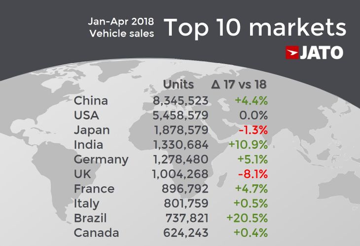 China is now the biggest car market in the world, and by some margin. For the first 4 months of 2018, it racked up 8.3 million vehicle sales. The USA is the second biggest, recording 5.5 million vehicle sales in the same period. Overall, January to April sales for 2018 are up 3.4% over the previous year, which is mostly down to continued global growth. Total sales for the first 4 months of the year reached 28.81 million units.