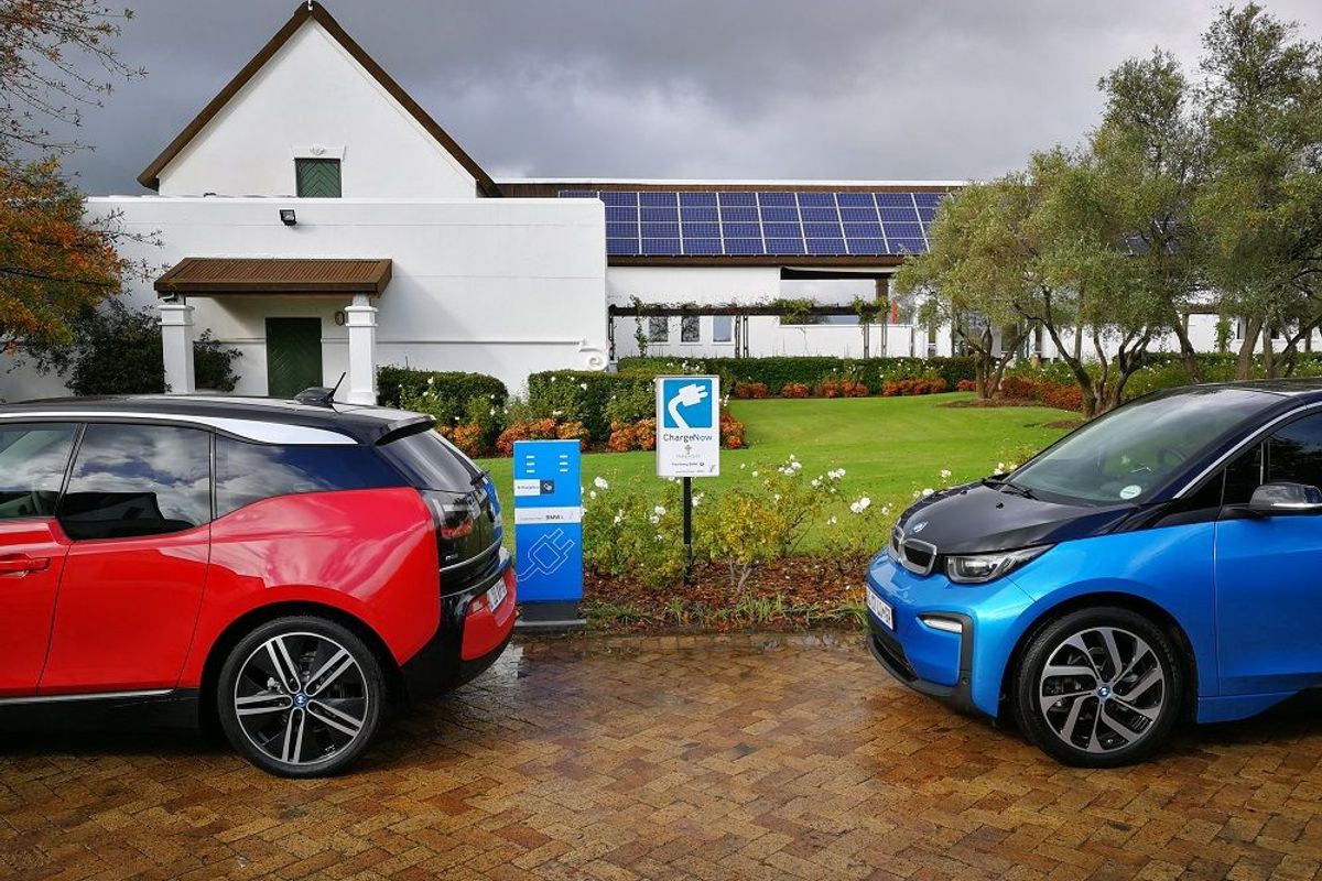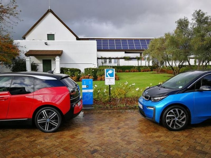 A brace of BMW i3 test units at Rust en Vrede wine estate awaiting a charge. Note the solar panels on the roof, which powers the car charger. This is how it should be done!