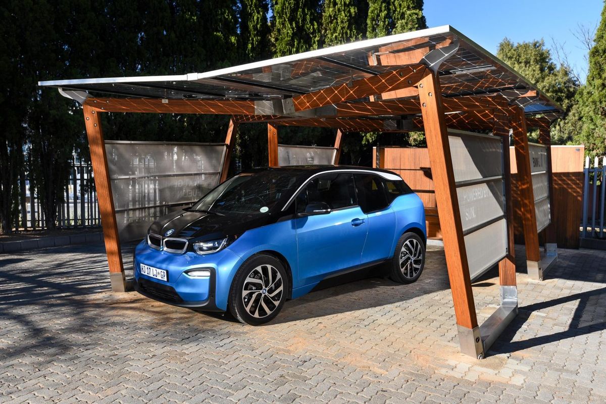 A facelifted BMW i3 charging at one of the solar-powered charging ports.