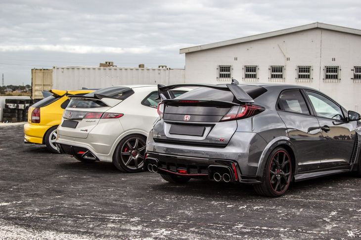 The translucent strip on the tailgate and triangular exhaust tips are unique to the FN2 (right)… A far cry from the EK9 (middle).