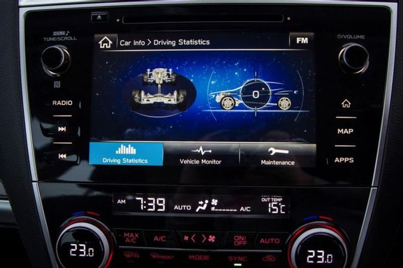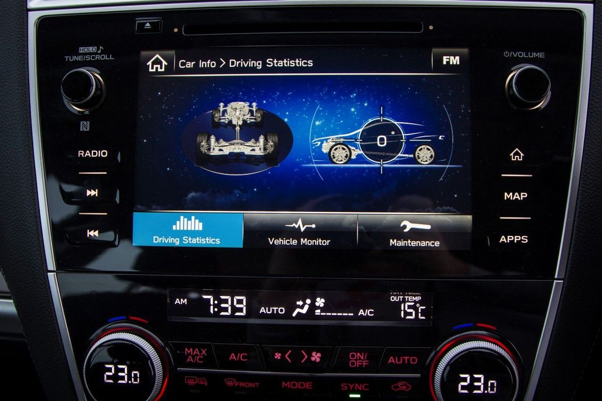 The Outback's infotainment system includes comprehensive driving information. Note new dual-zone climate controls lower down.