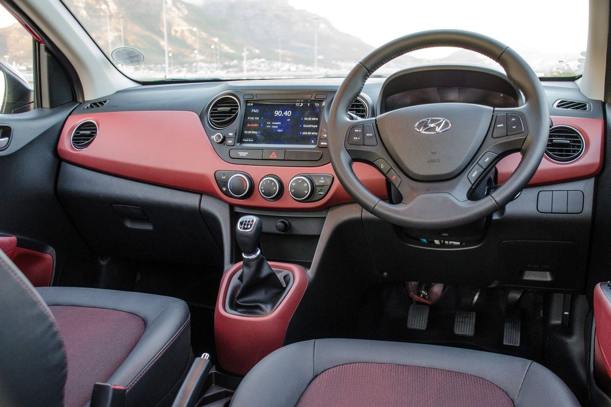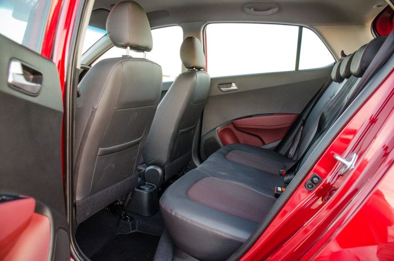 Splashes of red and the leather-wrapped steering wheel creates a sportier ambience in the Grand i10's cabin.