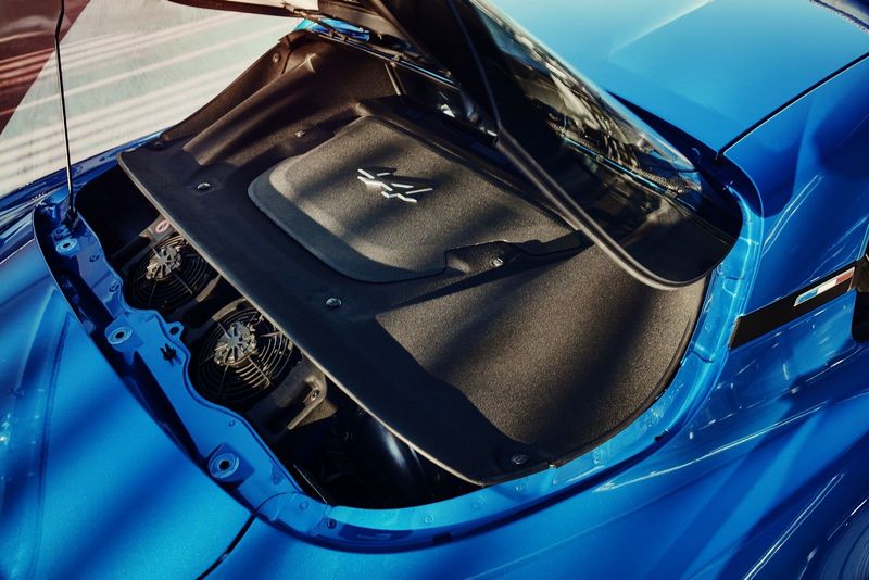 The suspension is unique to the A110, too: double wishbones, front and rear. Their presence means making everything fit into the car's 1.8-metre width is a pain. Wishbones occupy a fair amount of lateral space, and the engine has to be fitted transversely between the rear set, with the fuel tank sited between the front set. But it’s worth the effort: thanks to where the fuel tank sits, weight distribution is 44/56 front to rear, putting the centre of gravity square between the driver's and passenger’s respective hips. Tyre widths are 205 on the front, 235 on the rear; wheel diameter is 17-inch as standard on base Pure models, 18-inch on alternative Legende cars and this launch edition.