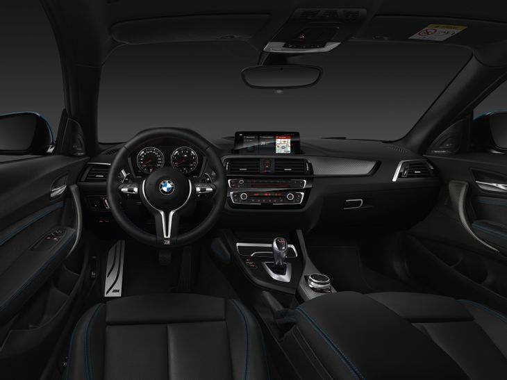 The M2 is pure mini muscle car, particularly in profile, and the aerodynamic addenda are eminently tasteful. The Long Beach Blue paint finish (one of only four colour options) lends the M2 a sense of theatre, which is helped by those eye-catching 10-spoke two-tone 19-inch rims and the quartet of burbling exhaust ends. The interior is derivative of the 1 Series/2 Series cabin, with “carbon-weave” trim, dashes of Alcantara (on the door cards) and contrast stitching being the most obvious supplementary adornments, apart from strategic M lettering. Oh, and then there’s the sound of the thing. You’ll struggle to get greater performance car music for less than R1 million.