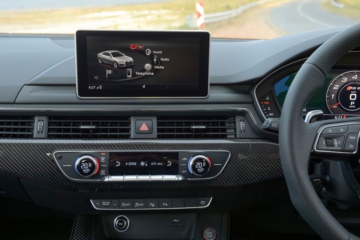 There are some nice performance touches to the infotainment screens and virtual cockpit dashboard. There's a G-Meter, power indicators and the rev counter has been configured to encourage you to stretch the car's legs. Approach the redline and the speedometer flashes red. Hook the next gear, rinse and repeat. There is also a lap timer if you're so inclined. Nice option to consider is the heads up display. Audi has gone all out to incorporate smartphones into the RS5's cabin. The car comes with Android Auto and Apple Carplay, there are numerous USB ports and there's also a wireless charging pad.