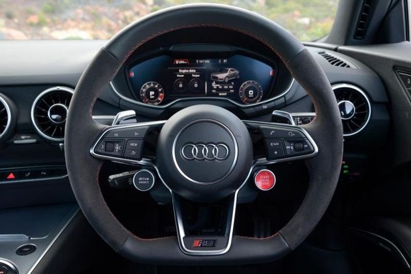 Audi has gone all out when it comes to the TT RS cabin. The steering wheel is a work of art and is not too dissimilar to that of the Audi R8 and features a start/stop button. The interior focus is aimed purely at the driver and Audi has cleverly positioned key functionality onto the steering wheel, allowing the driver to keep his/her hands on the wheel at all time. The pretty, yet intuitive Audi Virtual Cockpit digital dashboard is standard on the TT RS and it offers everything such as satellite navigation, a central rev counter which doubles as a speedometer and shift light. You'd expect a centrally-mounted infotainment screen, but the cabin is wonderfully minimalistic and the only thing you'll find is the ventilation controls, cleverly integrated into the turbine-style vents. The seats are exceptionally sporty and supportive – something you'd expect when driving a near-supercar.