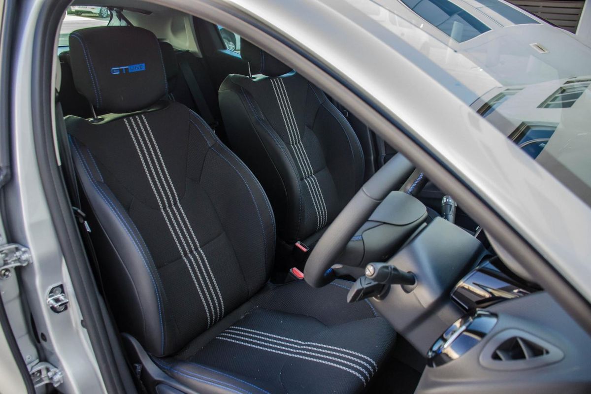 The sporty theme is carried over into the cabin where you will find sufficiently bolstered partial cloth and leather sports seats with GT-Line embroidery. They are comfortable to sit in and the blue stitching on the seats, leather RS steering wheel, leather gear lever and handbrake provide pleasant colour contrast in an otherwise grey/black interior. Blue air vent surrounds are a nice touch and perceived interior build quality is good.