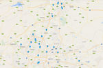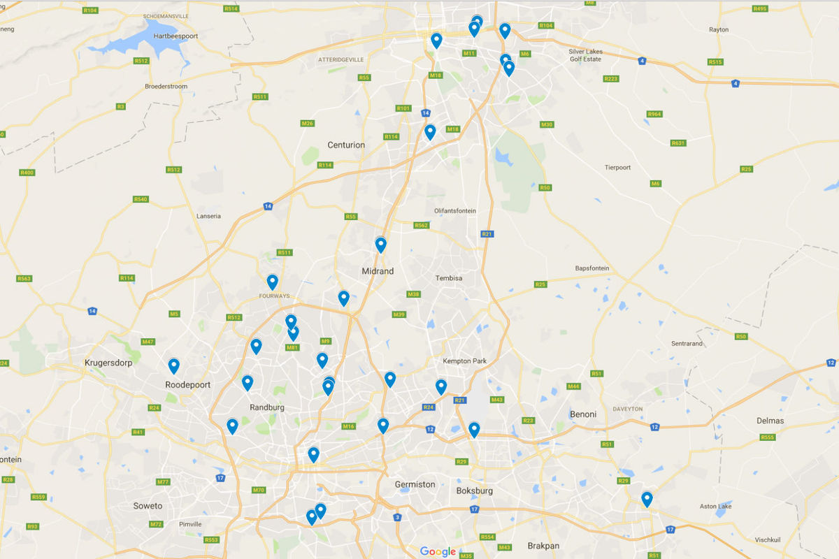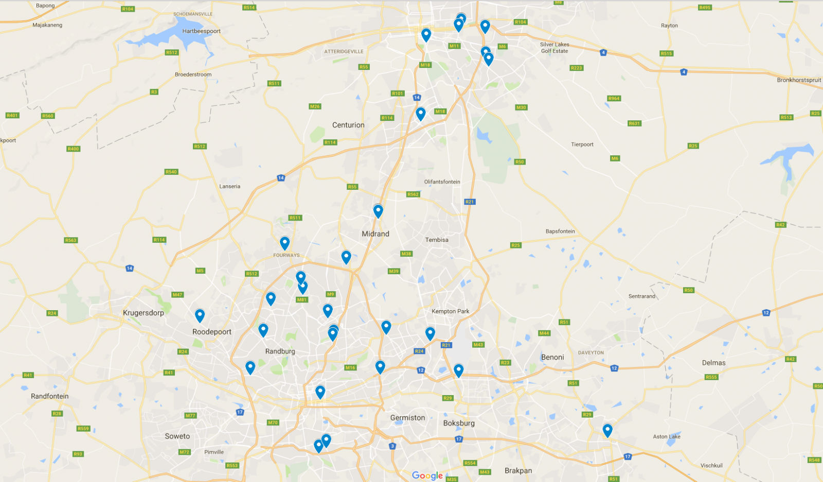 A map of Gauteng showing the location of the majority of EV charge stations.(blue pins)