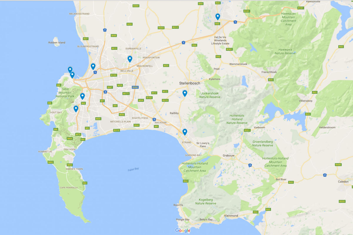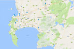 A map of the Western Cape showing the locations of the relatively few EV charge station locations. (blue pins)